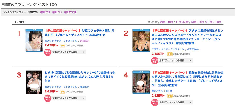 这是昨天FANZA的单日销售排行榜。 不